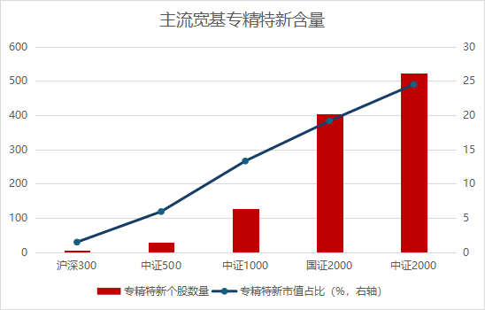 幾個(gè)主流寬基指數(shù)對(duì)比來(lái)看,中證2000指數(shù)的專精特新含量?jī)?yōu)勢(shì)十分明顯。