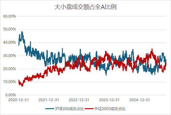 大小盤成交額占比對(duì)比情況來(lái)看,目前中證2000成份的成交額占全A比例略高于20%,無(wú)擁擠情況。
