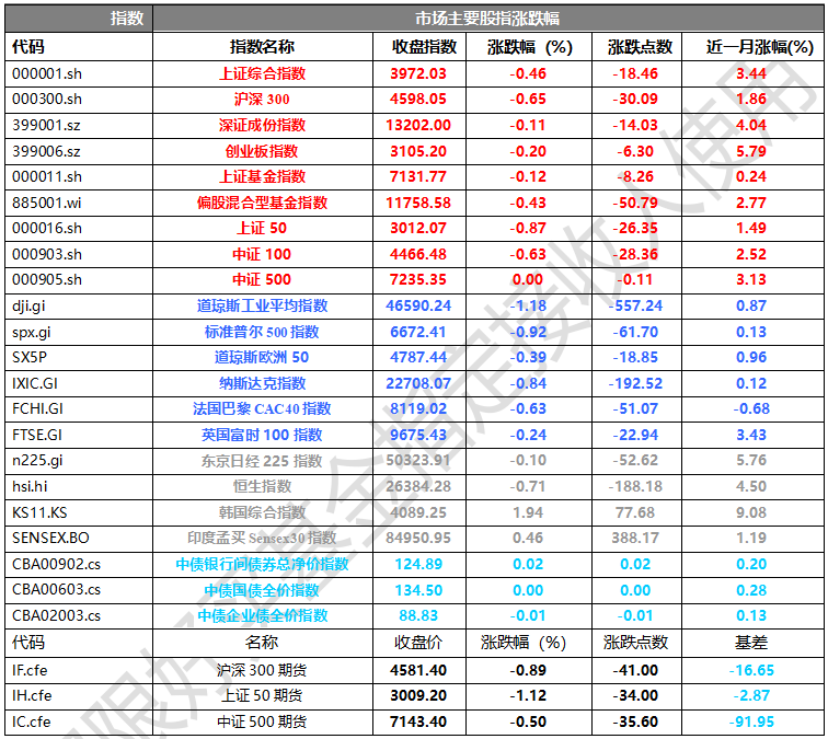 31個(gè)申萬(wàn)一級(jí)行業(yè)中有17個(gè)行業(yè)上漲。其中,計(jì)算機(jī)(申萬(wàn))、國(guó)防軍工(申萬(wàn))、煤炭(申萬(wàn))表現(xiàn)居前,漲跌幅分別為1.67%、1.59%、1.32%,非銀金融(申萬(wàn))、銀行(申萬(wàn))、醫(yī)藥生物(申萬(wàn))表現(xiàn)居后,漲跌幅分別為-1.11%、-1.31%、-1.73%。滬市有935只個(gè)數(shù)上漲,占比47.34%,深市有1560只個(gè)數(shù)上漲,占比56.71%。非ST個(gè)股中,93只個(gè)股漲停,11只個(gè)股跌停。股指期貨主力合約3個(gè)合約均下跌,其中,0只期指好于現(xiàn)貨指數(shù)。