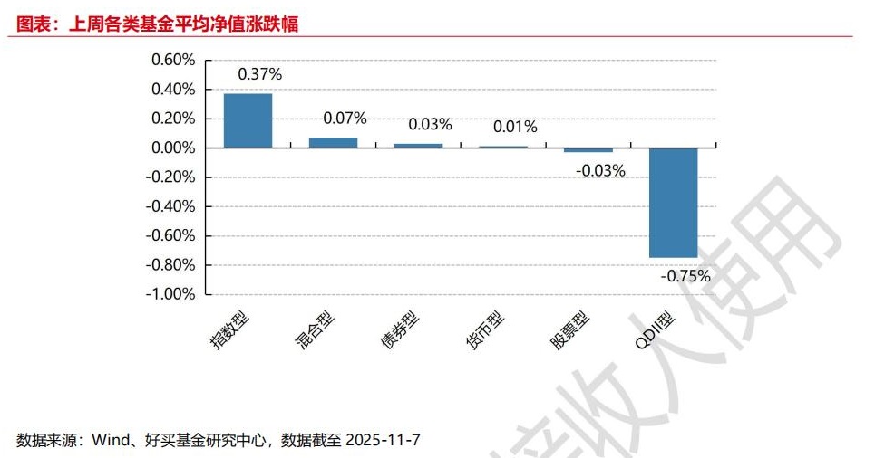 上周,國內權益基金漲跌不一,其中QDII型基金平均下跌0.75%,指數型和混合型基金平均上漲0.37%/0.07%。