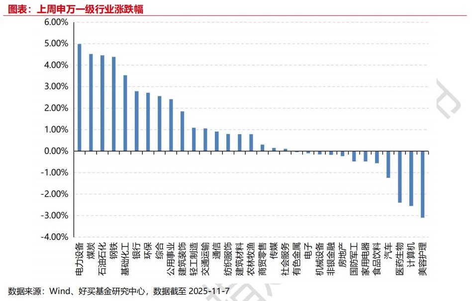 上周,滬深兩市雙雙收漲。截止收盤,上證綜指收于3997.56點,漲42.77點,漲幅為1.08%;深成指收于13404.06點,漲25.84點,漲幅為0.19%;滬深300收于4678.79點,漲38.13點,漲幅為0.82%;創業板收于3208.21點,漲20.67點,漲幅為0.65%。31個申萬一級行業中有19個行業上漲。其中,電力設備、煤炭、石油石化表現居前,漲跌幅分別為4.98%、4.52%、4.47%,醫藥生物、計算機、美容護理表現居后,漲跌幅分別為-2.40%、-2.54%、-3.10%。